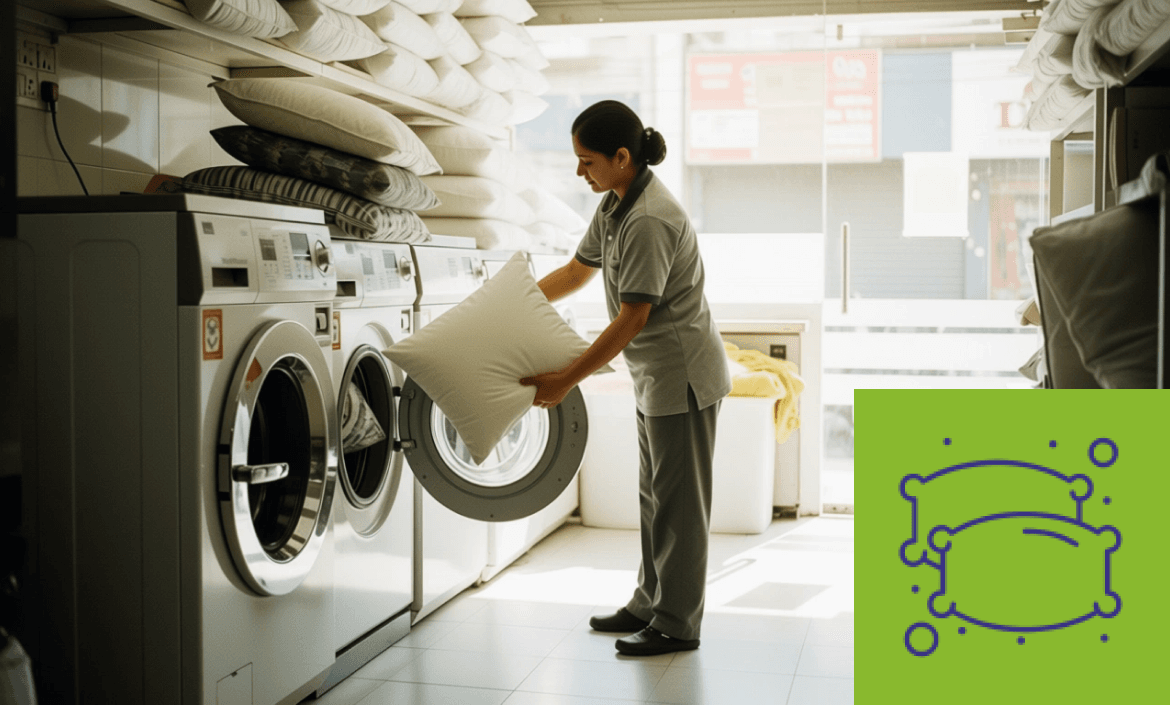 Sanitized dry cleaning eliminating dust mites and odors restoring softness, hygiene, and freshness.