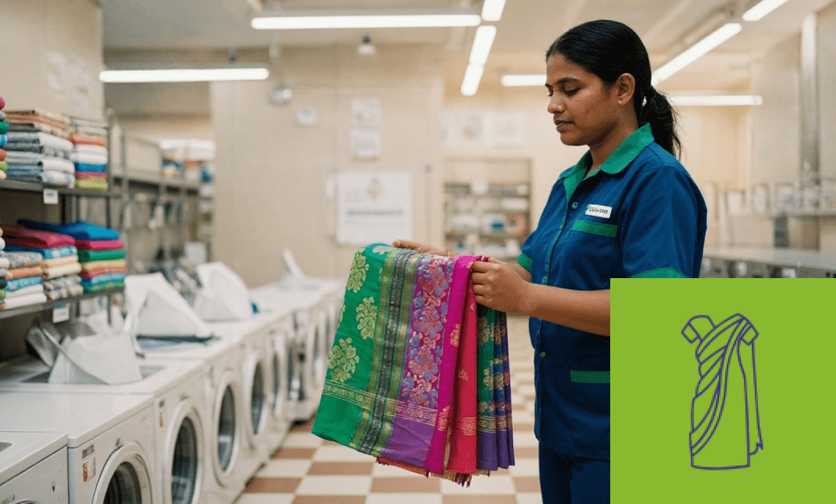 Expert saree handling preserving delicate fabrics, vibrant colors, and providing premium, gentle finishing.